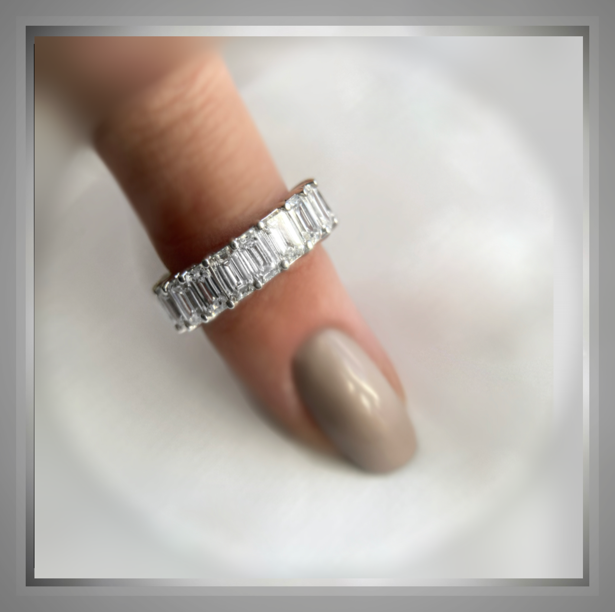 Half Eternity Band featuring 4.0o Ct of vibrant emerald cut diamonds set in an elegant modern band.  High quality perfectly matched diamonds cover the face of the ring.  The 14K white or yellow  gold band is sleek and minimal in design.