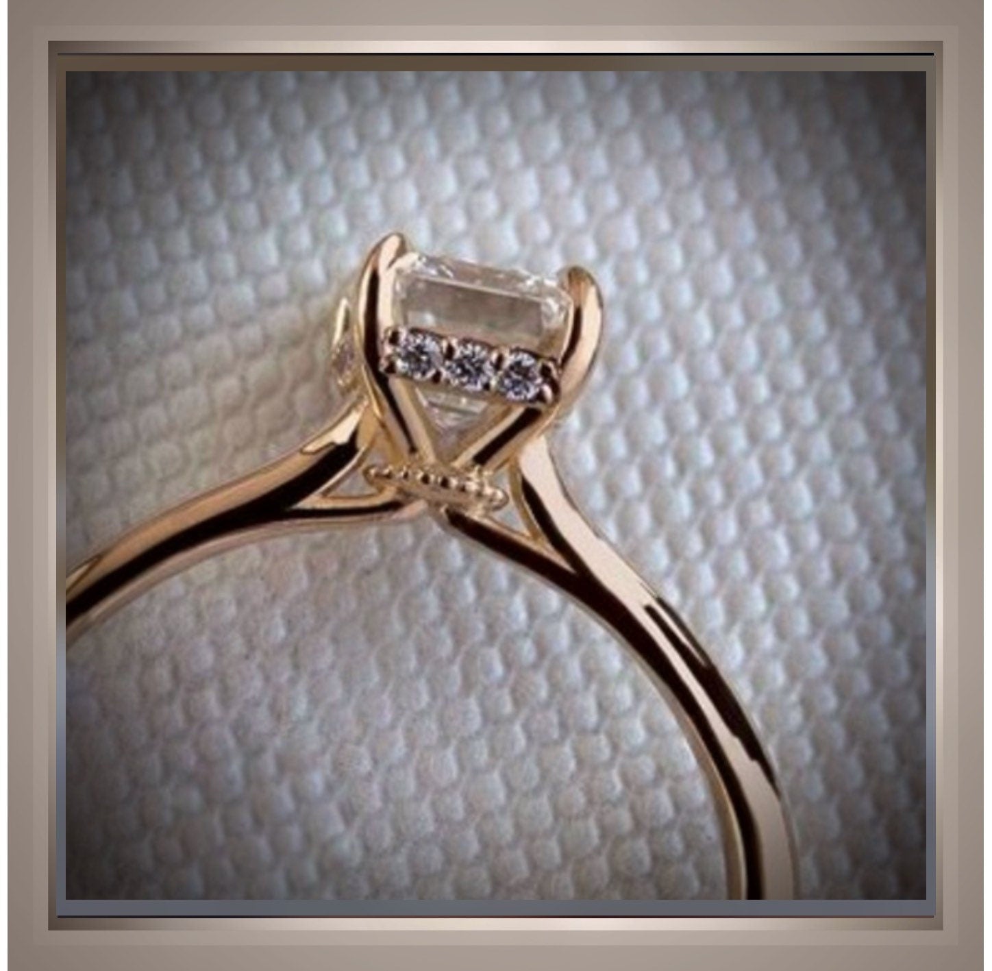 A gleaming 1.05 Ct Emerald Cut solitaire with a comfortable sleek 14K Yellow Gold setting that stacks well with other rings. Four elegant Claw prongs flow from an open basket gallery accented with diamonds.